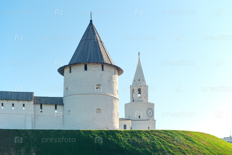 Белокаменная оборонительная Юго-Западная башня и Спасская башня Казанского Кремля.Казань, Россия