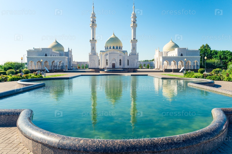 Красивый вид на белую мечеть с отражением в воде.Россия