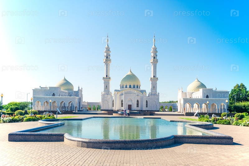 Красивый вид на белую мечеть с отражением в воде.Россия