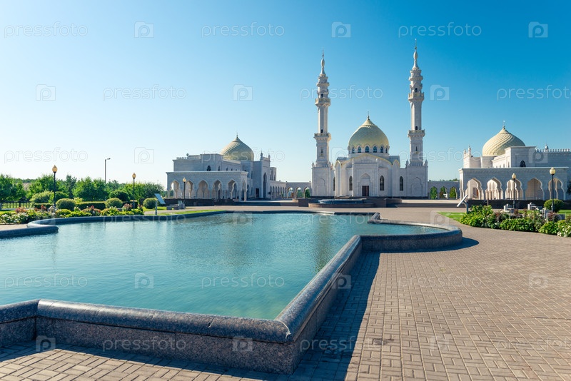 Прекрасный вид на белую мечеть с отражением в фонтане.Россия