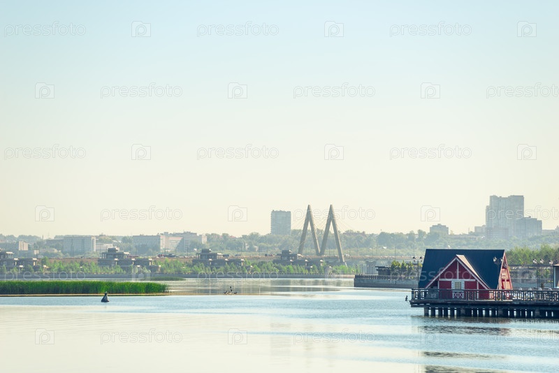 Живописный вид на реку Казанка, прибрежный дом и мост Тысячелетия