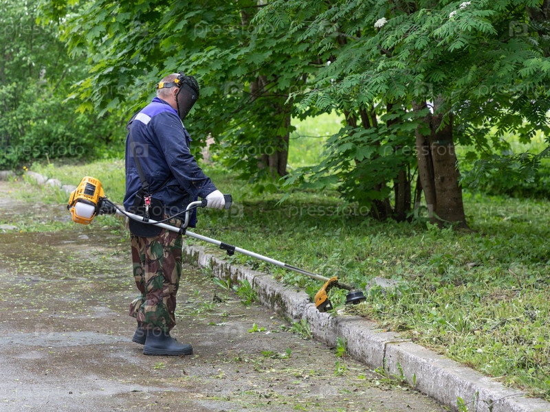 Мужчина-работник коммунального хозяйства в рабочей одежде и защитной маске стрижет траву с помощью триммера