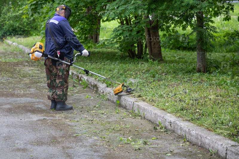 Мужчина-работник коммунального хозяйства в рабочей одежде и защитной маске стрижет траву с помощью триммера