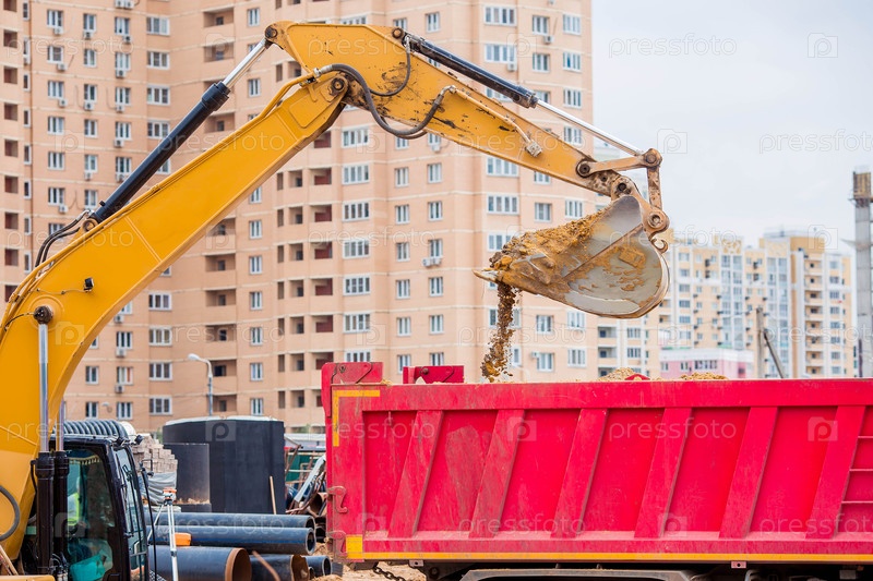 Экскаватор на стройплощадке крупный снимок экскаватор выкапывает землю ветром для строительства тяжелая техника для строительства и ландшафтного дизайна