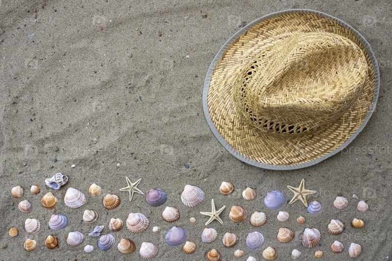 Соломенная шляпа в песке рядом с морскими звездами и раковинами на пляже