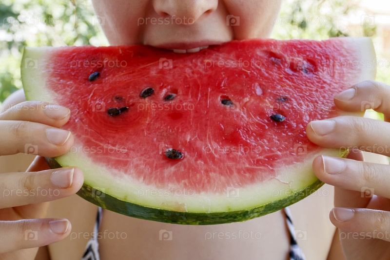 Близкий план куска спелой арбузы, съеденной неузнаваемой девушкой