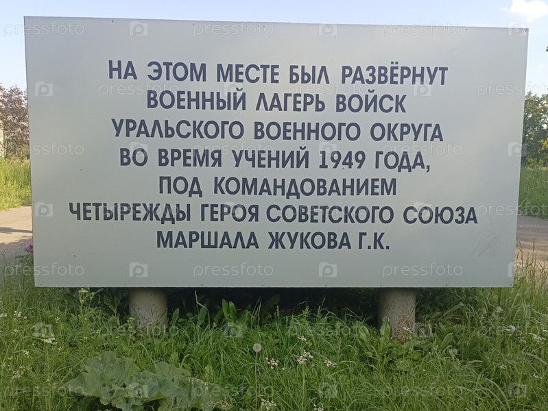 Знак военного лагеря на русском языке, подробно описывающий историю Уральского военного округа во время учений в 1949 году под командованием генерала Жукова