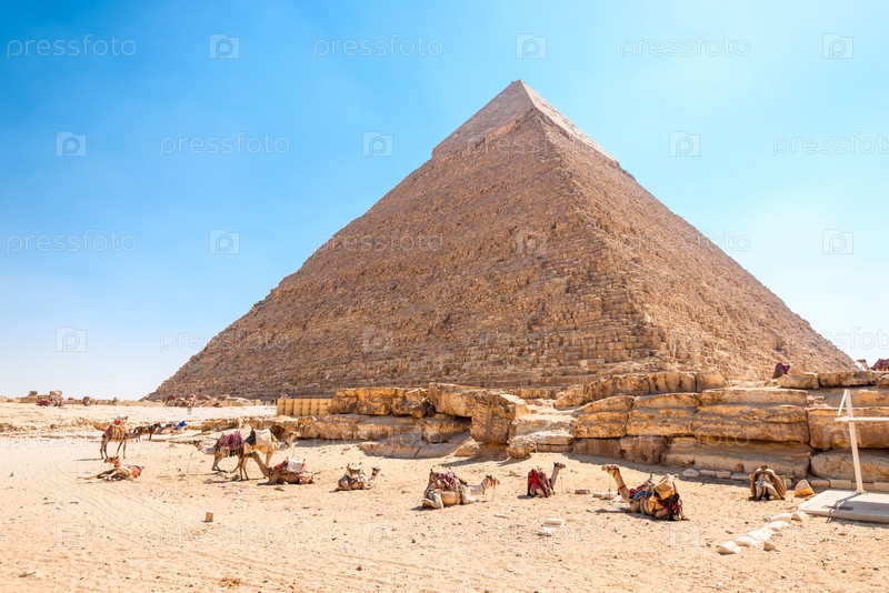 Верблюды отдыхают на фоне египетской пирамиды Хафры