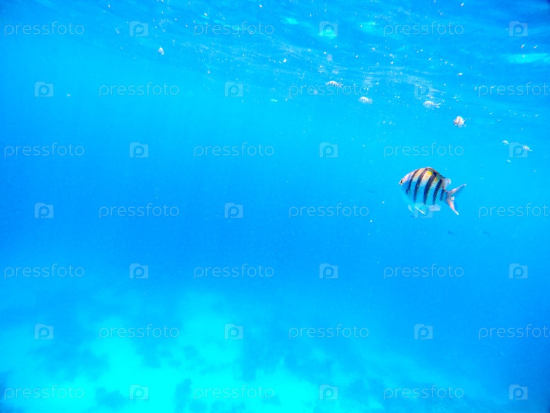 Тропическая рыба размером с сержанта плавает на голубых глубинах открытого моря в Красном море, Египет