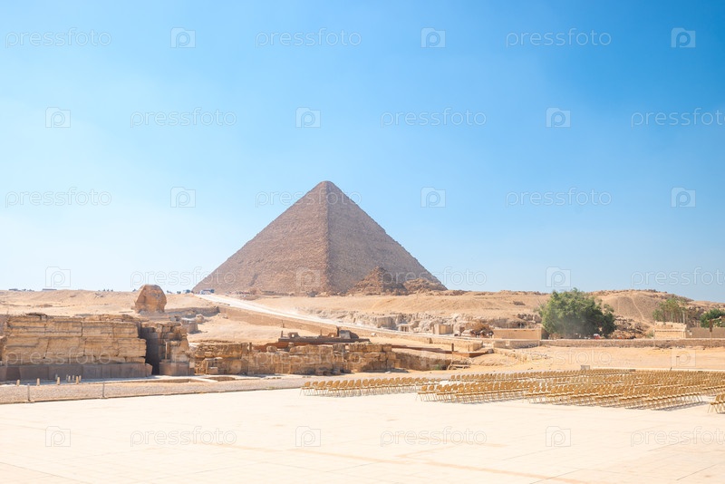 Живописный пейзаж с египетским Сфинксом на фоне древних пирамид под палящим солнцем пустыни Сахара