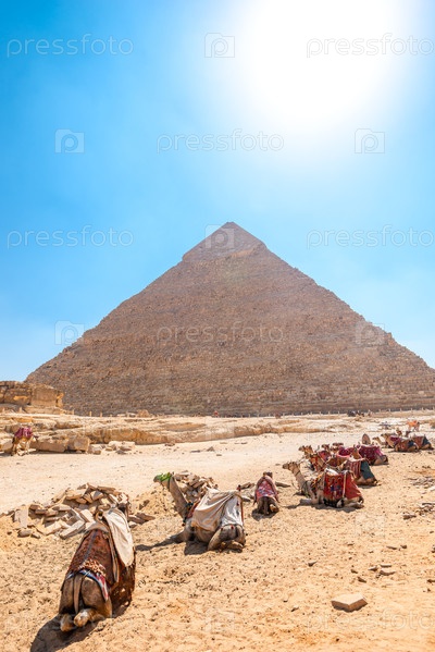 Верблюды отдыхают на фоне египетской пирамиды Хафры