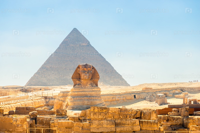 Величественный египетский сфинкс на фоне древних пирамид под палящим солнцем пустыни Сахара