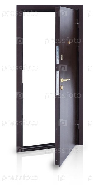 Модель открытой металлической входной двери, изолированной на белом фоне