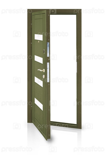 Модель открытой металлической входной двери, изолированной на белом фоне
