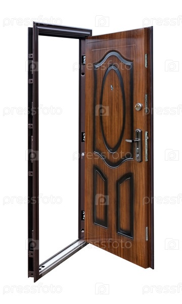 Модель открытой металлической входной двери, изолированной на белом фоне
