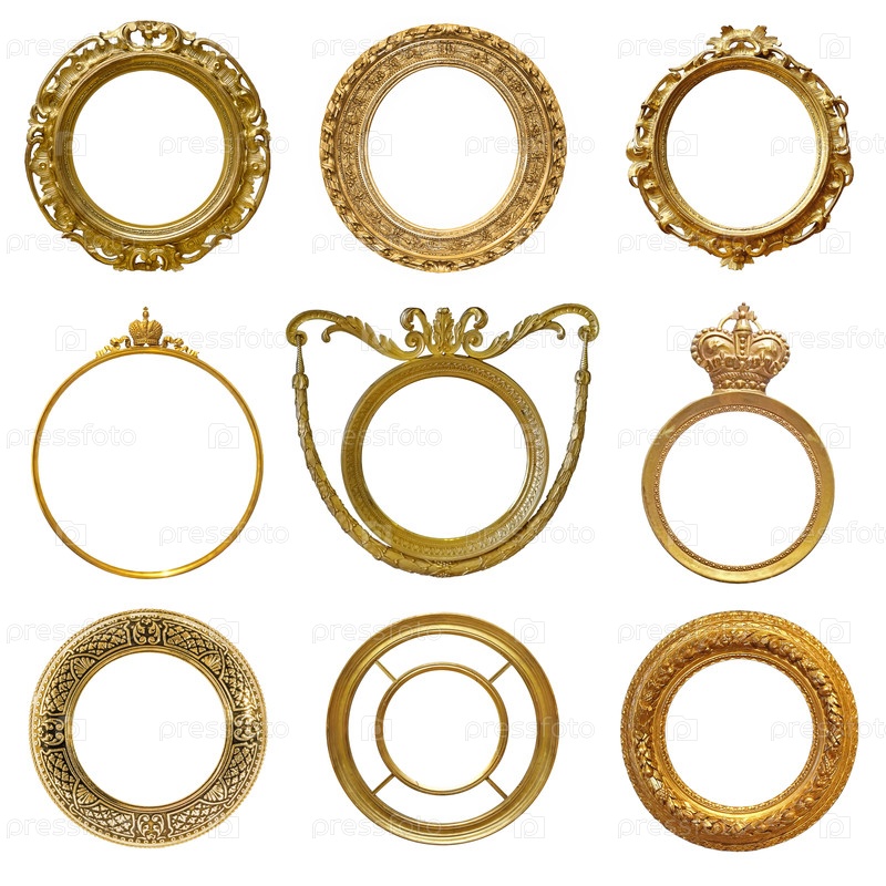 Набор золотых рамок для картин, зеркал или фотографий, изолированных на белом фоне