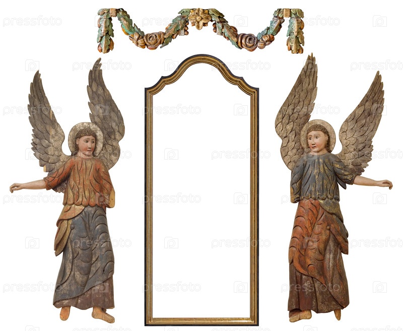 Набор готических деревянных рамок для картин, зеркал или фотографий и статуэтки изолированные на белом фоне
