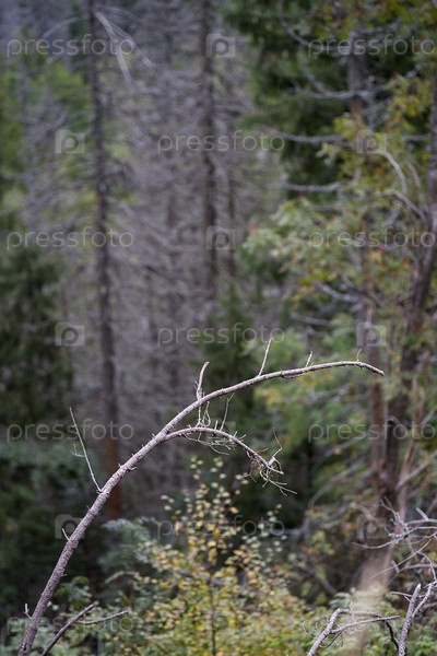 Летний пейзаж в лесу с сухой ветвью на переднем плане, изолированный фон