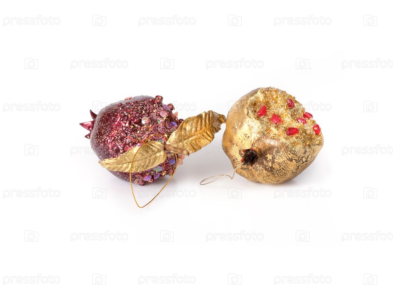 Золотые и красные гранаты украшают рождественскую елку, изолированную на белом фоне