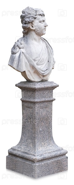 Мраморный античный бюст бога на гранитном пьедестале, изолированном от белого фона