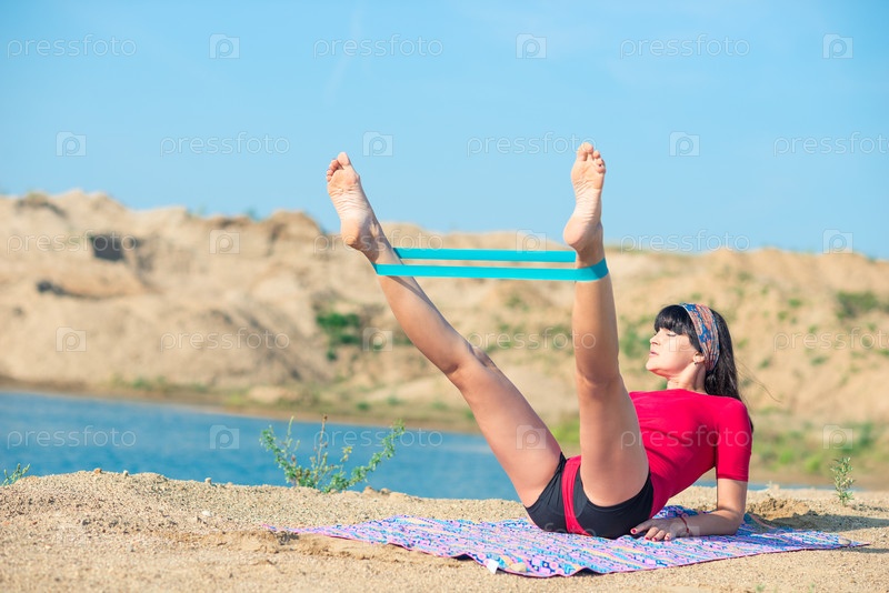 Тонкая атлетическая девушка делает упражнения на ногах с помощью резинового экспандера на пляжном песке возле воды