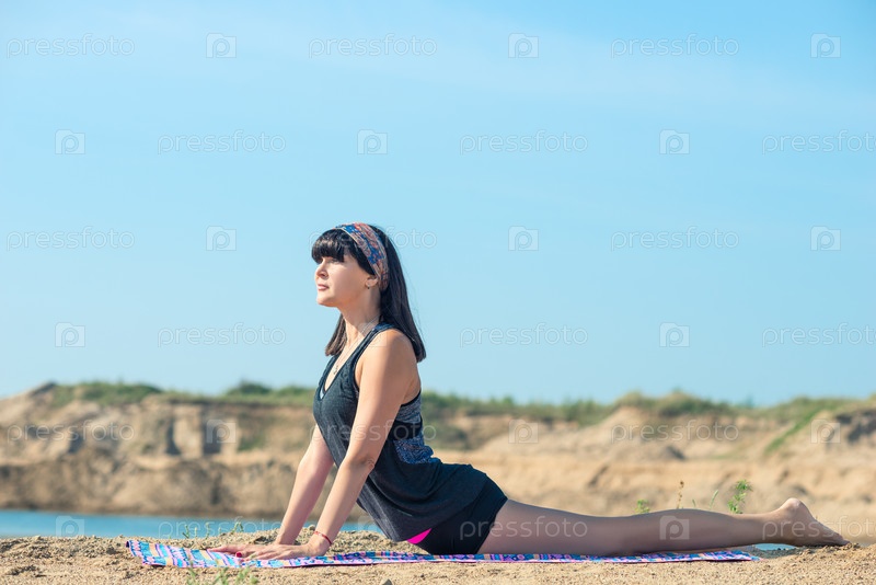 Тонкая атлетическая девушка занимается йогой в кобре, позирует асанам на пляже рядом с водой