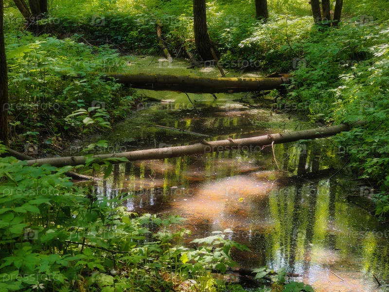 болото в зеленом летнем лесу