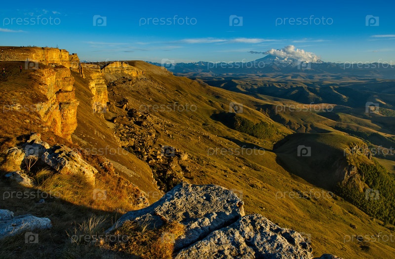 Потрясающий вечерний вид на заснеженную вершину Эльбруса с скалы Большого плато Бермамит