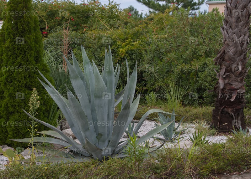 Величественный вид гигантского американского агава в орнитологическом парке на побережье Черного моря.Агав цветет один раз в возрасте 15-20 лет, после чего умирает