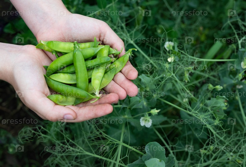 Свежесобранный зеленый горох, собранный из процветающего сада в конце весеннего сезона