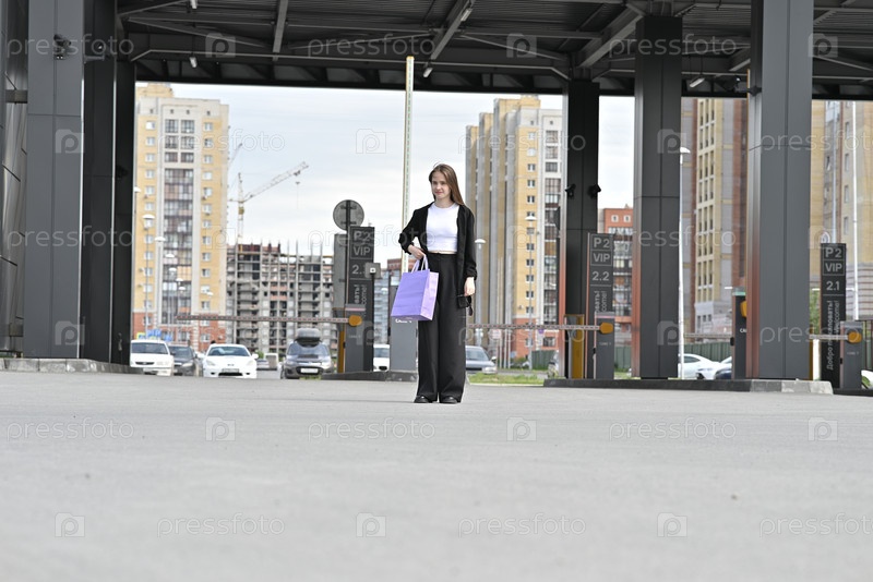 Женщина пересекает улицу с фиолетовой сумкой в случайном черном наряде на пешеходном перекрестке