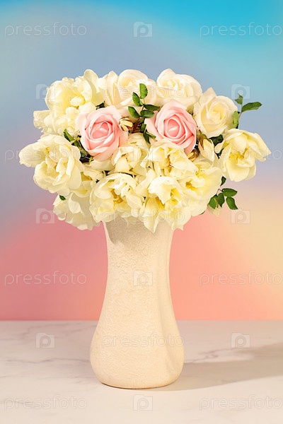 натюрморт с красивыми цветами колумбина, кремовой розой и дикой розой в вазе на элегантном современном столе, абстрактная цветовая аранжировка. шаблон для вашего дизайна с пространством для текста, минималистическая концепция красоты, прекрасная цветочная