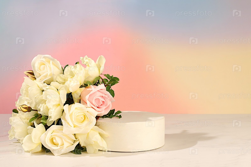Творческий шаблон для вашего дизайна. Продукт пустой подиума и кремовые розы. Абстрактная цветовая аранжировка с розниками, баннером. Минимальная современная эстетика, элегантная концепция красоты