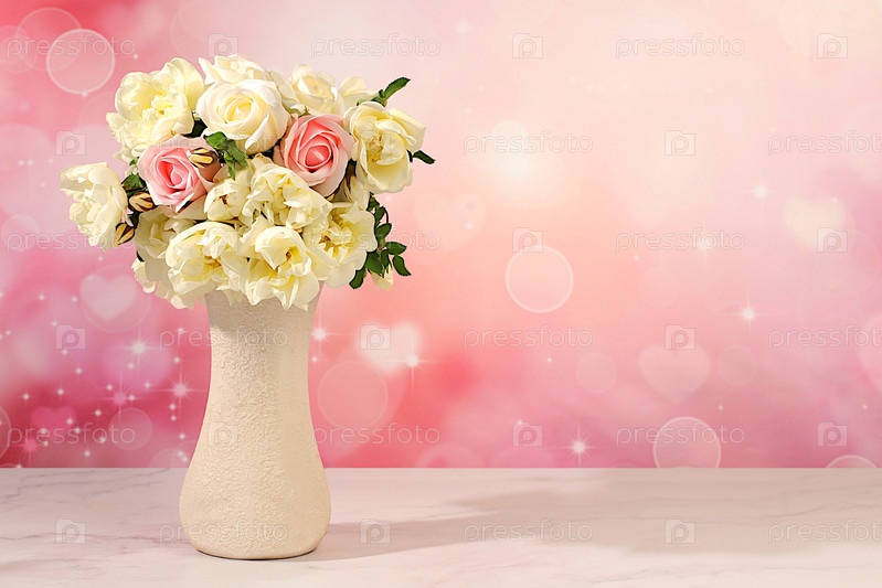 натюрморт с красивыми розовыми бедрами и сливочными цветами роз в вазе на элегантном современном столе, абстрактная цветочная аранжировка. шаблон для вашего дизайна с пространством для текста, минималистическая концепция красоты,