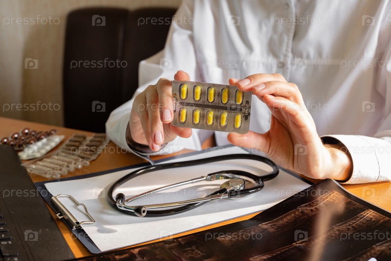 Врач держит различные таблетки и капсулы, нося стетоскоп