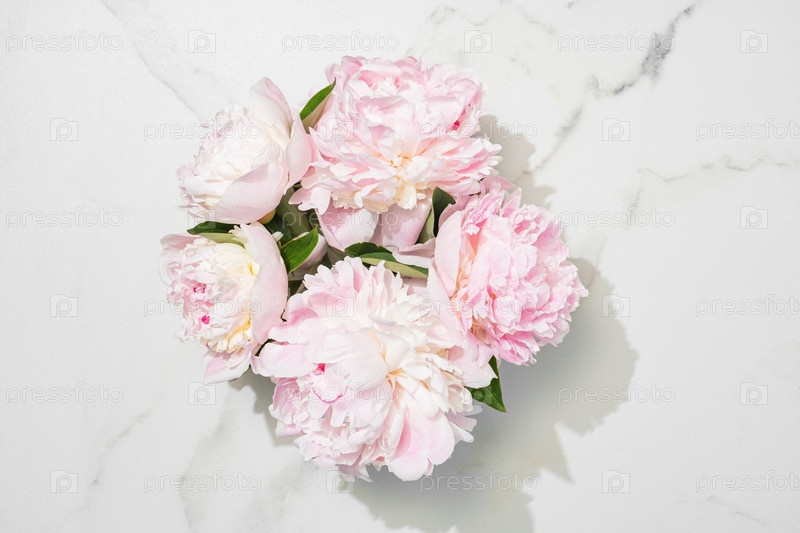 Цветочная композиция. Розовые цветы пионки на белом мраморном фоне. Плоская. Вид сверху с копировальным пространством. День матери или свадебный фон. Концепция праздника. мокап
