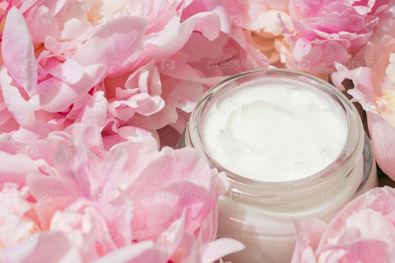 Белая банка с сливочными и пионными цветами. косметический продукт по уходу за кожей пустая темная стеклянная упаковка. бутылка небрендового лосьона, бальзам, расположение крема для рук, плоский лежащий