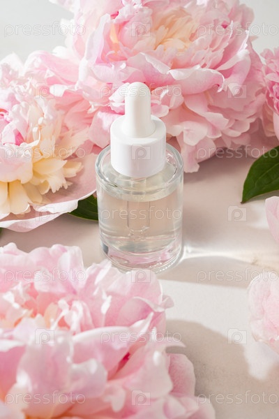 На свежем фоне цветы пионки и бутылка с косметической сущностью для брендинга.Уэлнесс, домашний уход за кожей и спа-процедуры расслабляют.Мокап-пакет