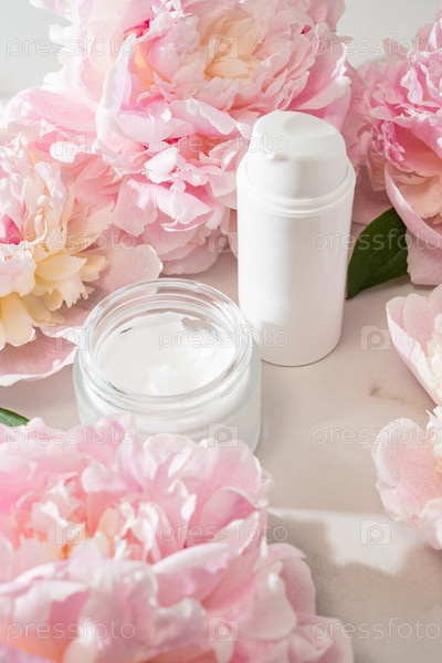 Концепция натуральных органических растительных ингредиентов в косметологии, экстракты из растений и цветов. Экстракт пионика для антивозрастной и акне терапии, косметическая упаковка для ухода за кожей лица и тела