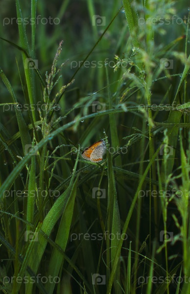 Красочная бабочка отдыхает среди высокой зеленой травы на солнечном лугу утром