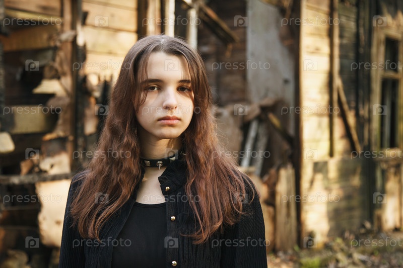Молодая готическая девушка выходит из заброшенного дома в мрачный летний день