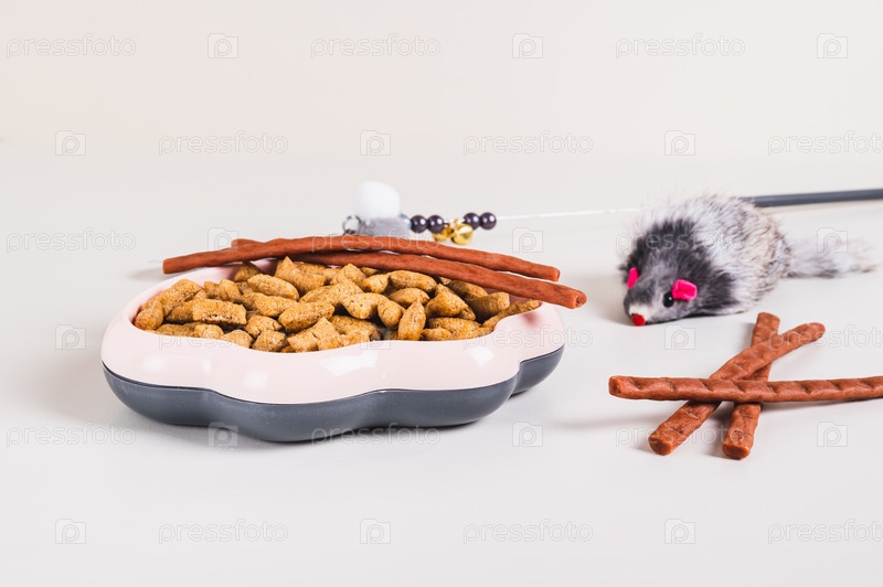 Тарелка с кошачьим кормом, лакомствами и игрушками на столе