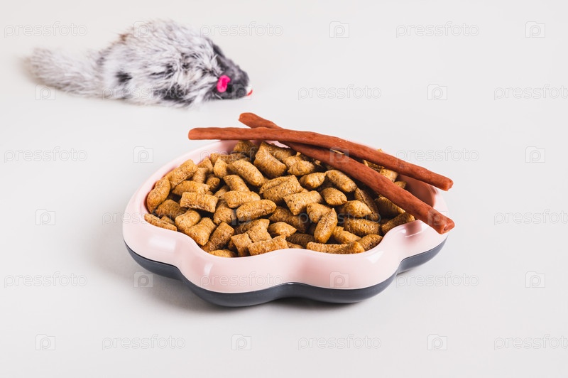 Посуда с сухими кошачьими гранулами и игрушечными пушистыми мышами на столе
