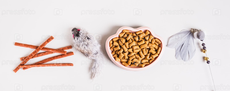 Пища для домашних животных и предметы по уходу за кошками на светлом фоне верхнего веб-баннера
