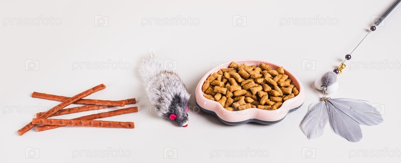 Чаша с кошачьим кормом, лакомствами и игрушками на веб-баннере стола