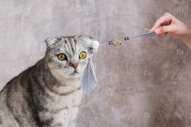 Серый кот смотрит на игрушку на палочке