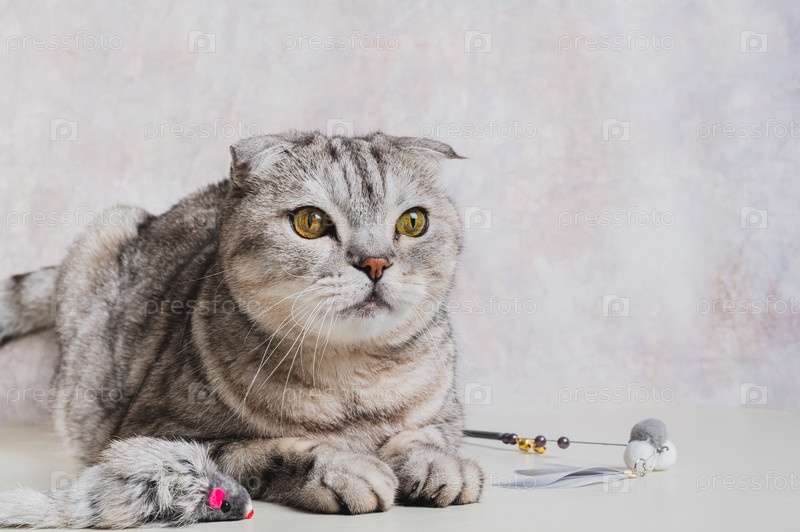 Серый кот лежит рядом с тизерной игрушкой на палочке и пушистой мышью