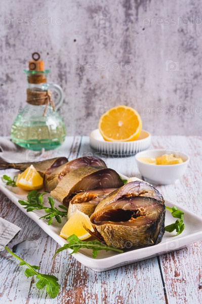 Холодные копченые кусочки скумбрия, лимона и ругулы на тарелке на столе вертикальный вид