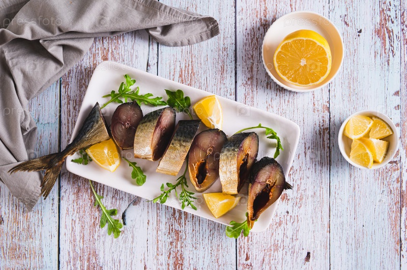 Холодные копченые кусочки скумбрия, лимона и ругулы на тарелке с видом на верхний стол