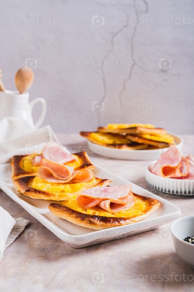 Хрустящие гребешки с ананасом и прошутто на тарелке на столе вертикальный вид